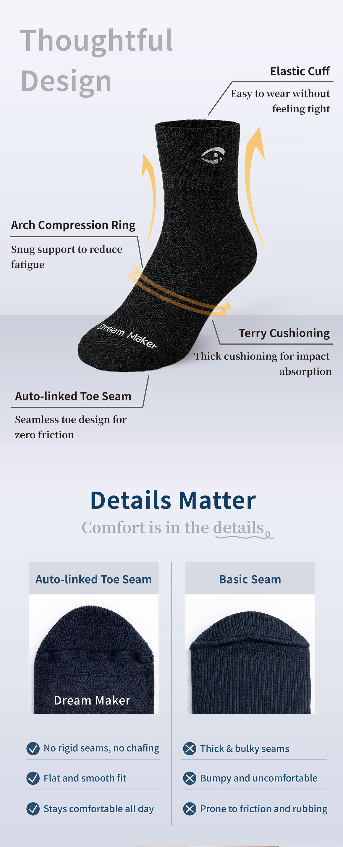 • 極致親膚趾尖無縫+高彈性襪口,服貼不磨腳、不留痕。